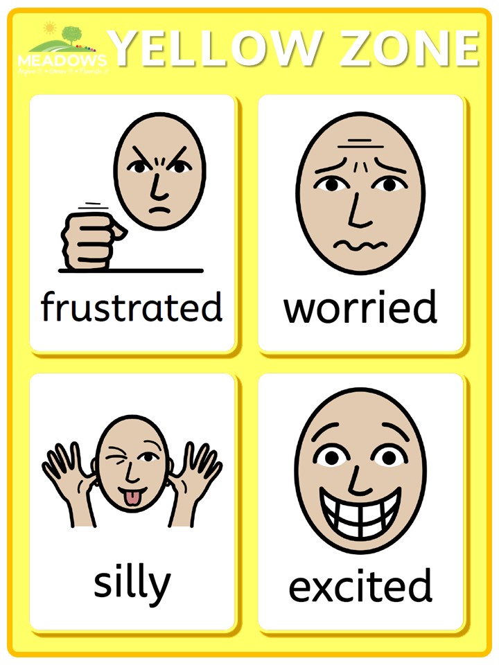 Yellow Zone: The Yellow Zone describes a person with additional levels of energy and elevated emotions, but remains in control. An individual may be facing nervousness, wiggles, silliness, excitement, anxiety, frustration or stress.
