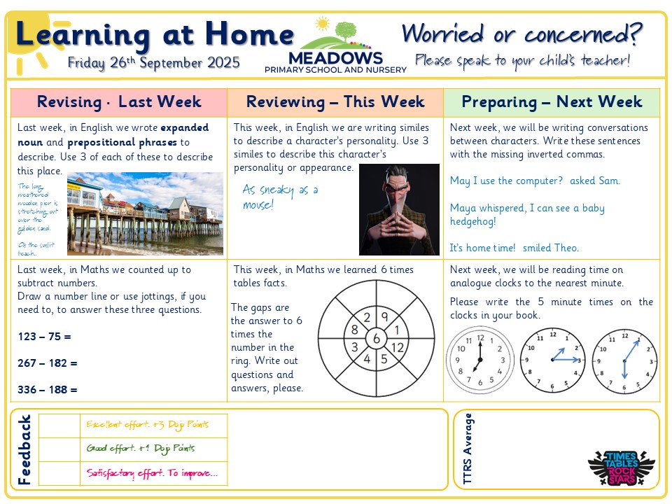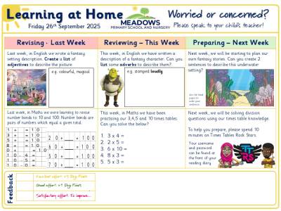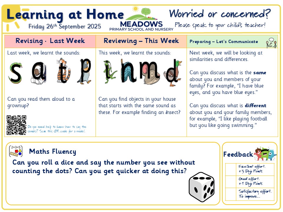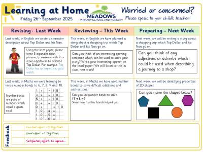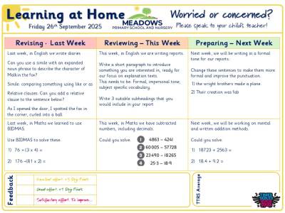 At Meadows Primary School and Nursery we aim for all children to Aspire, Grow and Flourish. To support this we like to encourage children to enhance their learning experiences through learning at home activities.