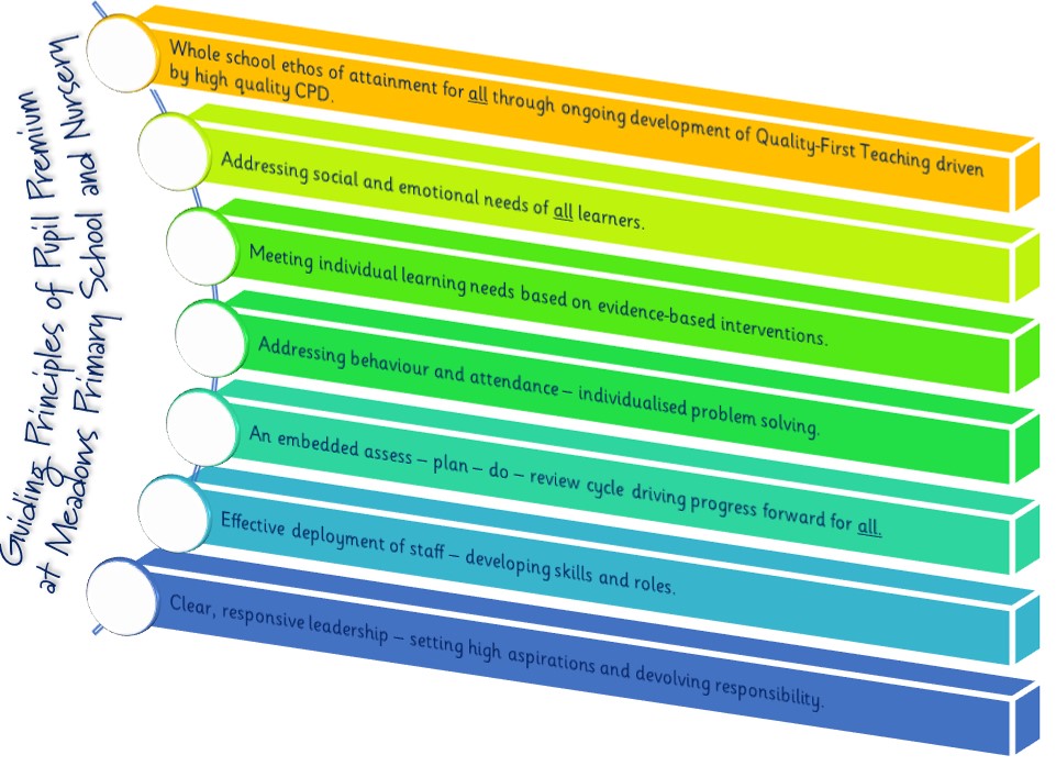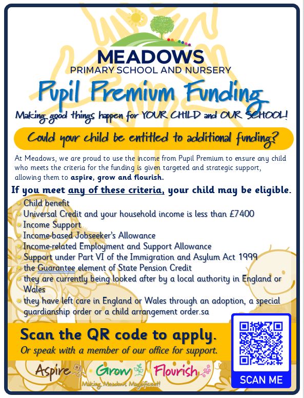 At Meadows, we are proud to use the income from Pupil Premium to endeavour to ensure any child who meets the criteria for the funding allocated to the school is given targeted and strategic support to learn as effectively as possible. Pupil Premium at Meadows is led by Mrs Ann Cox. Mrs Cox ensures the very best spending of the Pupil Premium fund, in order to best champion the life opportunities of those entitled to the fund. Mrs Cox is happy to support any parent, carer, colleague or other agency with any questions they may have regarding Pupil Premium in our school.