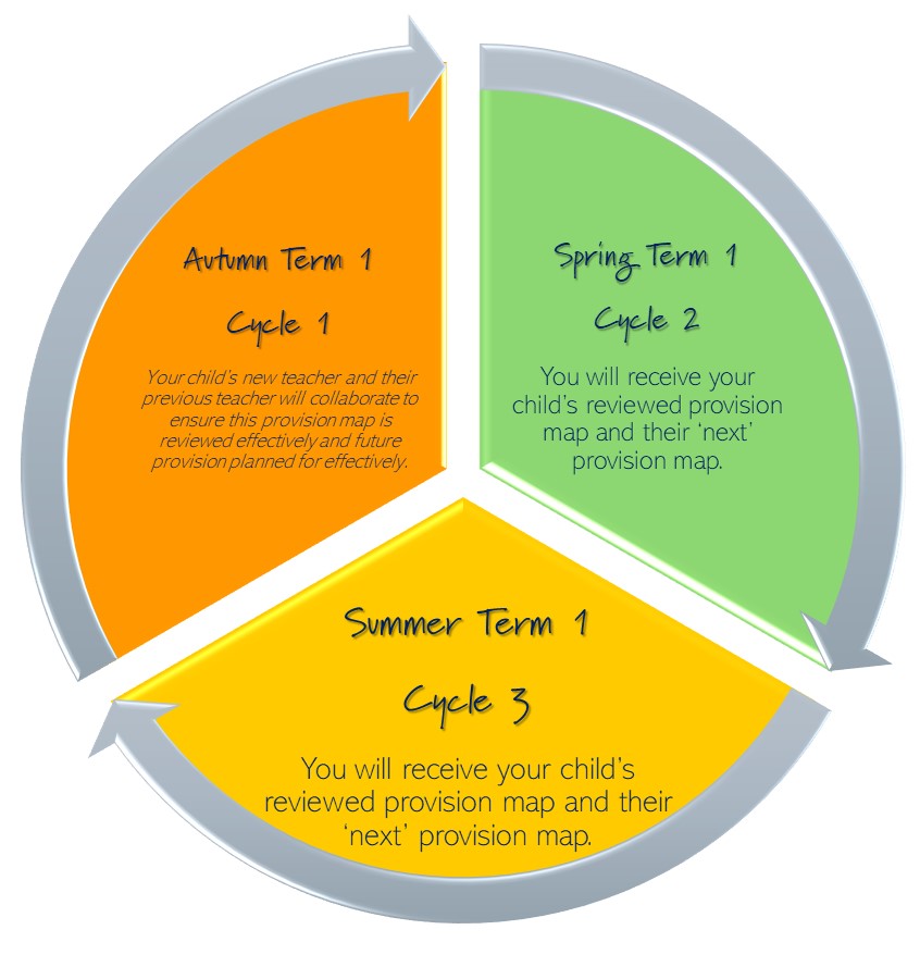 Our SEND Provision Maps are formed around a developmental, cyclical process of 'assess, plan, do and review'. Some provision maps may be reviewed more than three times within a calendar year, but in general three times is appropriate.