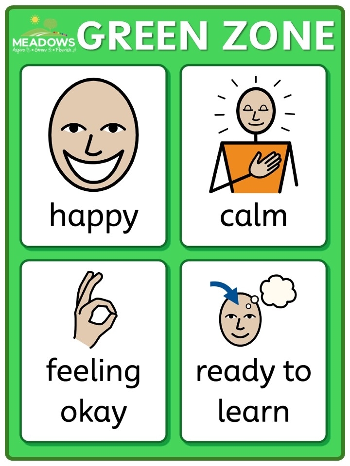 Green Zone: The Green Zone depicts calmness and the feeling of being in control. A person in the green zone may be described as content, focused or happy and certainly ready to learn.
