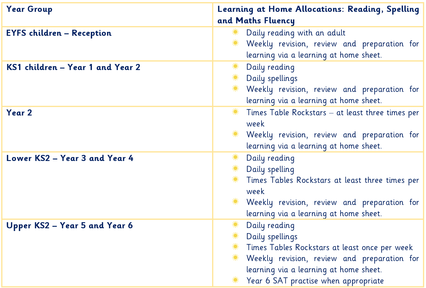 Our Learning at Home expectations are explained to parents as part of a child’s induction to school.