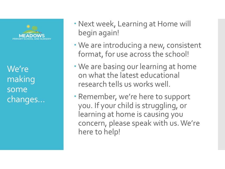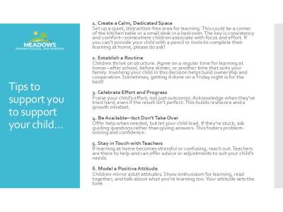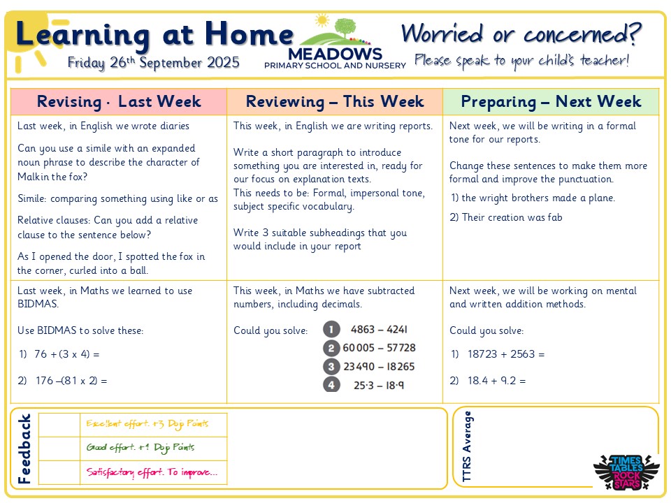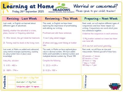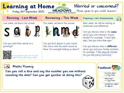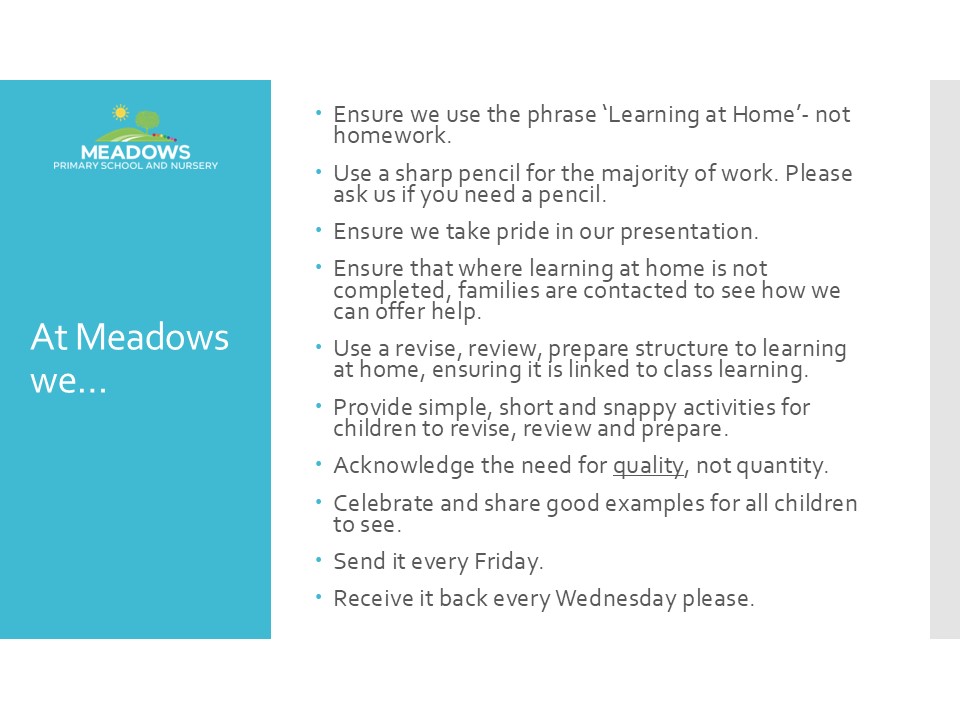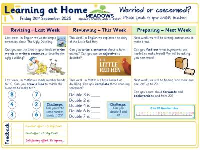 At Meadows Primary School and Nursery we aim for all children to Aspire, Grow and Flourish. To support this we like to encourage children to enhance their learning experiences through learning at home activities.