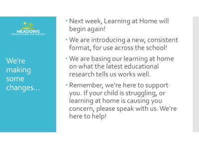 Staff also provide additional information about Learning at Home in their half-termly curriculum newsletters to parents and further information can be found on the school website.