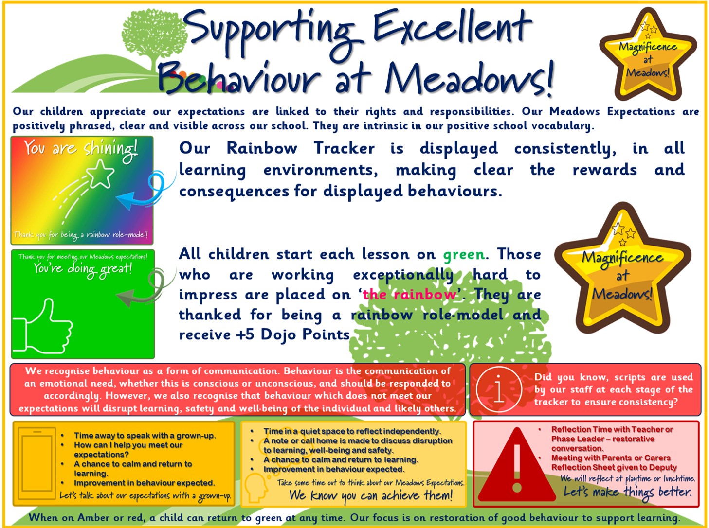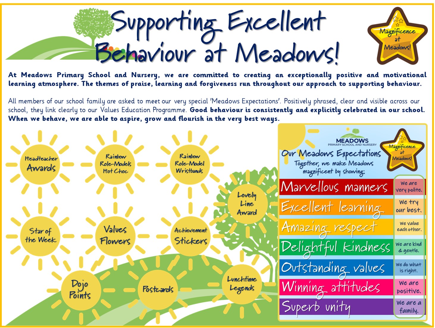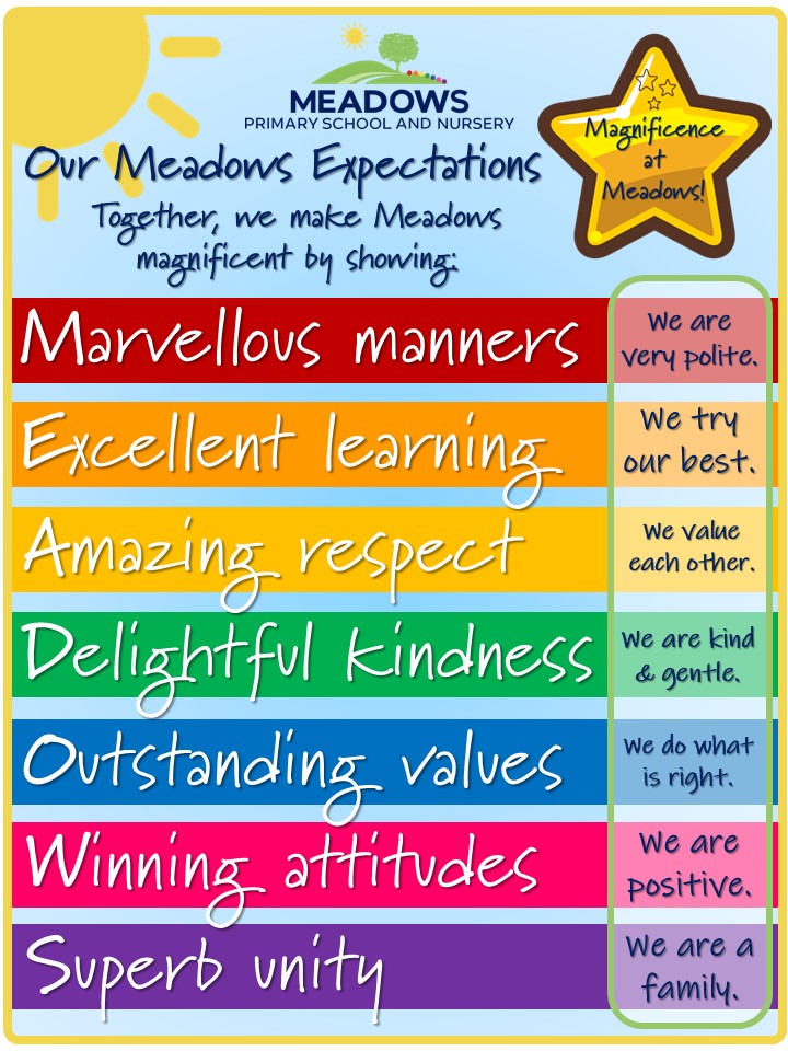 All members of our school family are asked to meet our very special 'Meadows Expectations'. Positively phrased, clear and visible across our school, they link clearly to our Values Education Programme.
