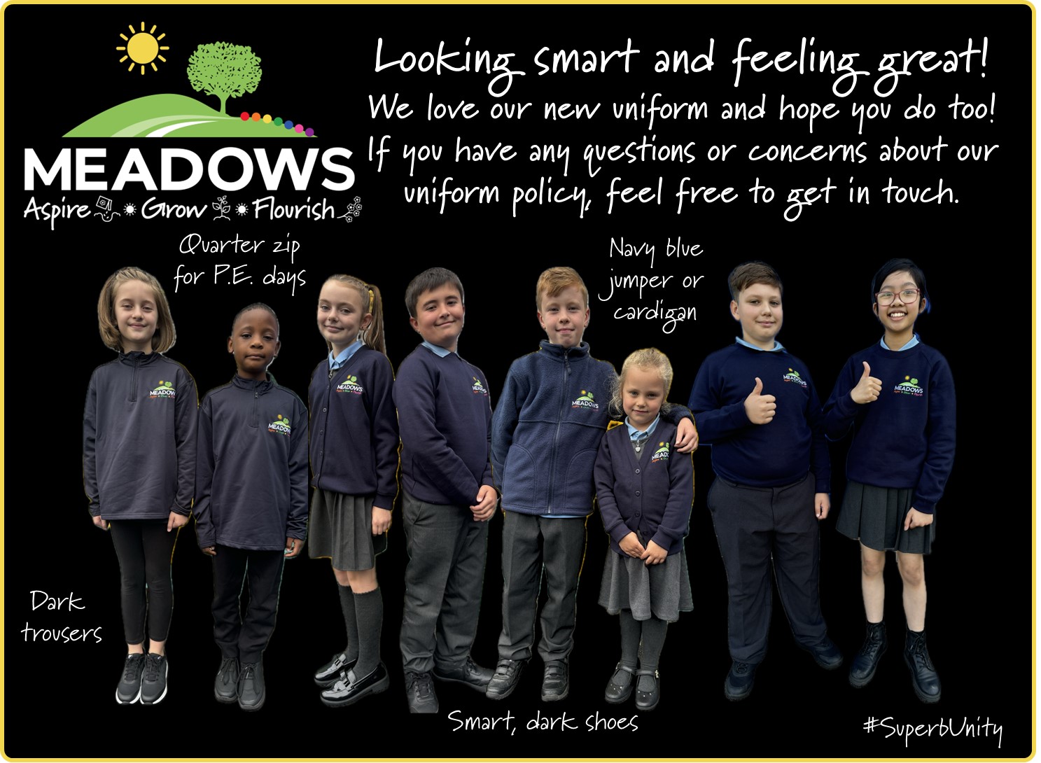 At Meadows Primary School and Nursery, we believe children should feel a sense of pride in being a member of our school family. This is reflected in the pride they show when wearing our school uniform.