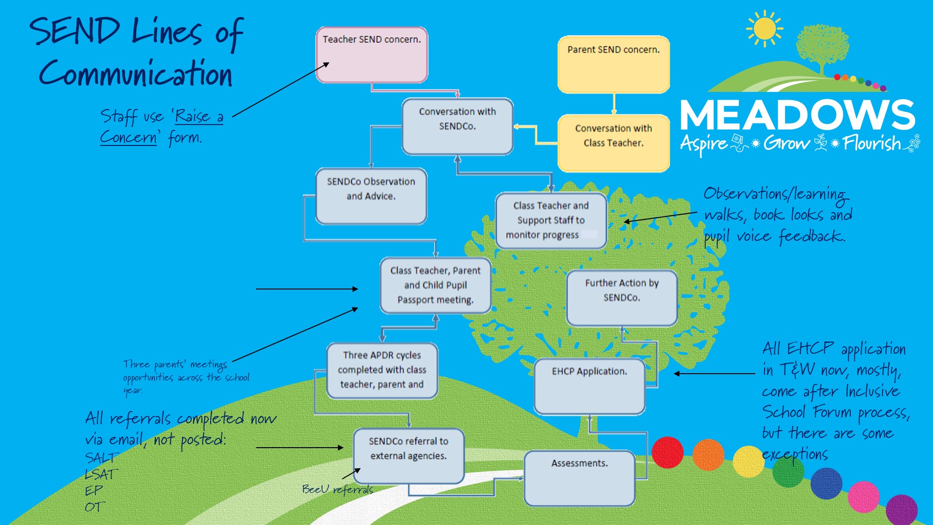 At Meadows Primary School and Nursery, we are unwavering in our commitment to ensuring that every child has the opportunity to aspire, grow, and flourish. We believe that a careful and thoughtful consideration of the four areas of special educational need and disability (SEND) is essential in understanding how best to support each child's unique learning journey. Our dedicated staff work tirelessly to create an inclusive environment where all children are nurtured and valued for their individual strengths and needs.