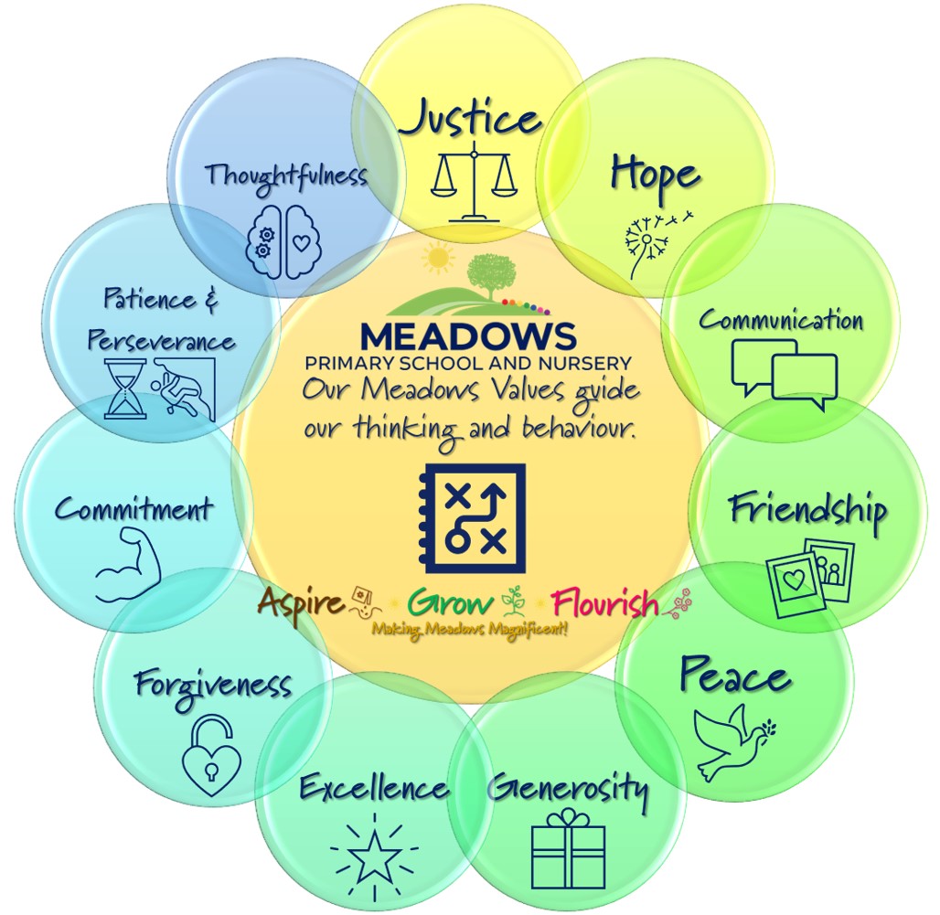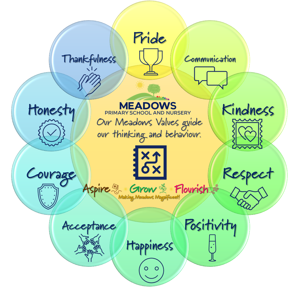 Values are principles which guide our thinking and behaviour. They underpin and combine with our Meadows Expectations and Curriculum to ensure that socially and morally our children are enabled to aspire, grow and flourish in their lives.